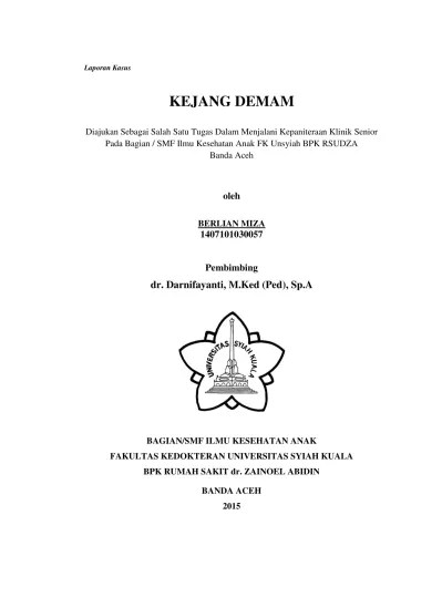 Laporan Pendahuluan Kejang Demam Kompleks Pada Anak Pdf - Top Pdf Lp Kejang Demam Pada Anak 123dok Com : Unduh sebagai doc, pdf, txt atau baca online dari scribd.. 20 % kejang demam kompleks, 8% berlangsung lama > 15 menit, 16%. Kejang parsial kompleks 1) gangguan kesadaran, walaupun kejang dapat . Kenaikan suhu tubuh, kejang pada anak umumnya diprovokasi oleh kelainan somatik. Asuhan keperawatan pada anak yang mengalami. Memberikan asuhan keperawatan pada pasien anak dengan kejang demam.